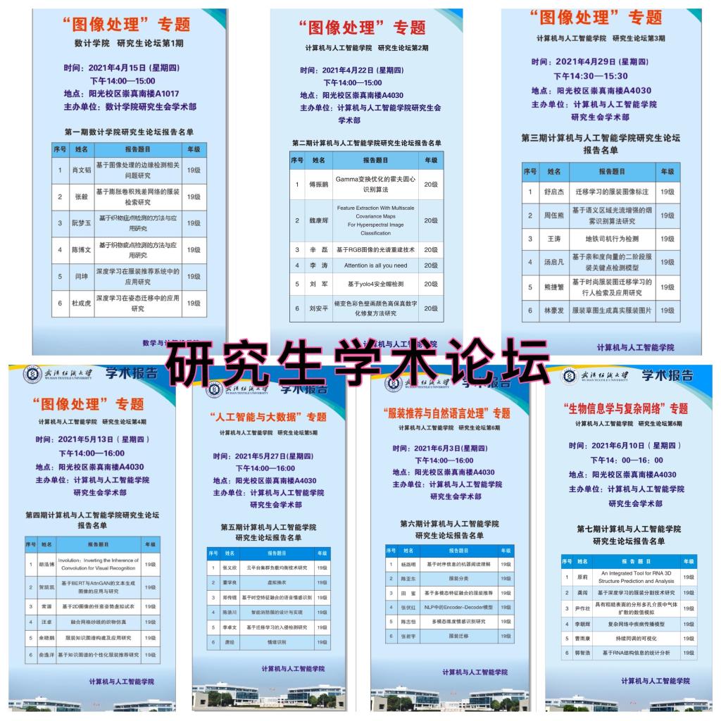 已举办研究生学术论坛七期。主要围绕图像处理、服装推荐与自然语言处理、生物学与复杂网络等主题开展。