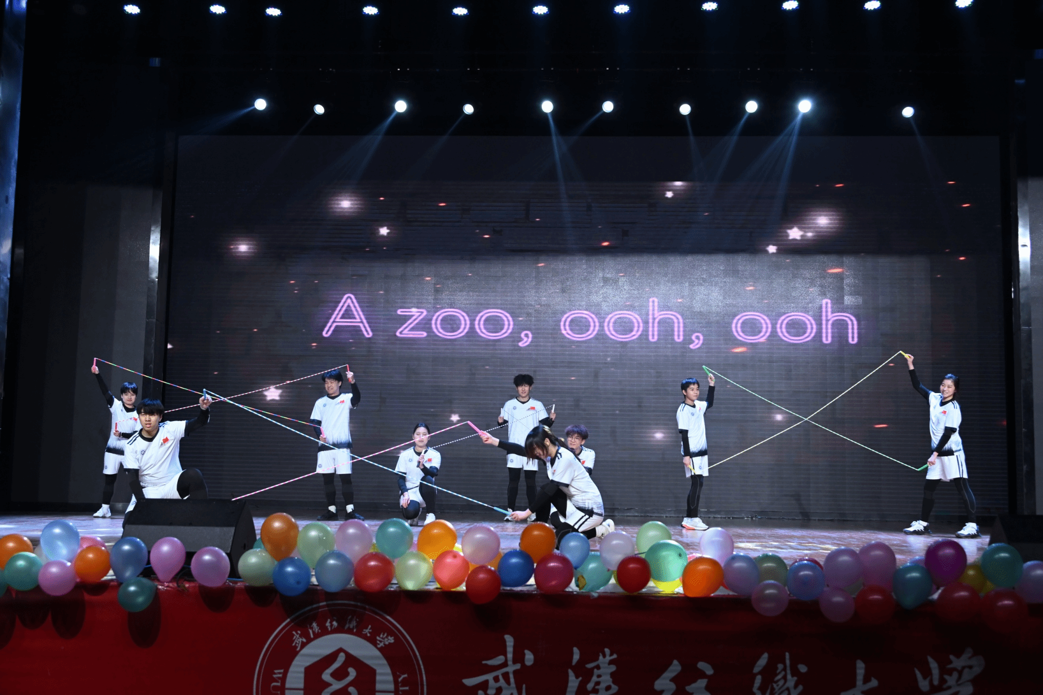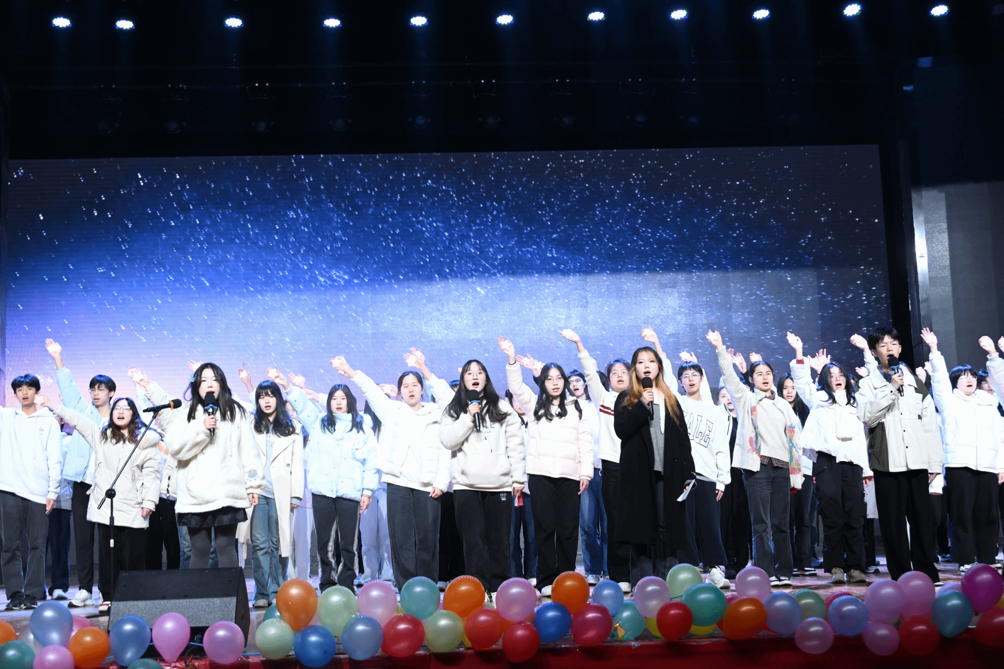 “破晓·智现”篇章延续精彩,小品《课间十分钟》精准还原校园日常的趣味瞬间,满是青春活力与纯粹欢乐;舞蹈《钟》以极具感染力的肢体语言诉说时光故事,引人深思;《sparks fly》《无名的人》《爱的回归线》歌唱串烧曲风多变、情感饱满,瞬间点燃全场热情。“星河·同辉”篇章中,班主任老师姚迅带来的歌曲《我爱你中国》和学生带来的歌曲《闪耀》旋律激昂、传递奋进力量;《珊瑚海》器乐演奏曲调悠扬、余韵悠长;《紫荆映莲,共盼团圆》朗诵+合唱节目饱含深情,诉说家国情怀;《相亲相爱》舞蹈节奏欢快、氛围热烈,再次将晚会气氛推向顶点。丰富多样的表演形式、精彩纷呈的节目内容,让整场晚会亮点迭出、掌声不断。