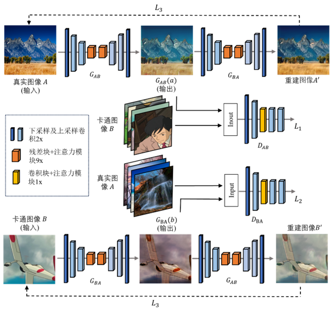 图像卡通化是计算机视觉领域的核心技术之一,在社交媒体、影视制作、儿童教育、广告设计等方面具有广泛应用。然而,传统卡通化方法在生成具有显著性卡通特征的图像时存在不足,且容易出现结构混乱、彩色伪影、丢失原始图像内容等视觉质量问题。针对这些挑战,论文创新性地提出了基于注意力机制的CycleGAN方法(AMCycleGAN)。该模型利用卷积注意力模块(CBAM)增强对图像高层语义特征的提取能力,通过在生成模型的残差块和判别模型的卷积块中引入通道与空间注意力机制,自适应聚焦于关键卡通风格特征,显著提升了模型的特征学习与判别能力,实现了清晰边缘、平滑色彩阴影和相对简单纹理的高质量卡通化效果。
