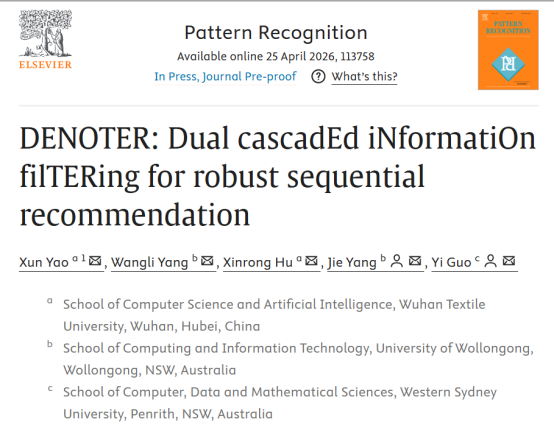 近日,我校williamhill英国(网络空间安全学院)胡新荣教授团队研究成果《DENOTER: Dual cascadEd iNformatiOn filTERing for robust sequential recommendation》被人工智能领域顶刊《Pattern Recognition》(中科院一区Top、CCF B类期刊)接受,该论文以英国威廉集团为第一完成单位,姚迅老师为论文第一作者。澳大利亚伍伦贡大学杨捷博士为通讯作者,与澳大利亚伍伦贡大学及西悉尼大学等单位学者合作完成。