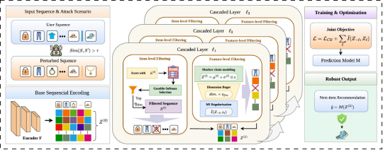 该研究通过特征过滤与项目过滤交替执行的多层优化结构,逐步削弱输入序列中受对抗扰动的项目与特征所产生的干扰。无需额外的数据增强策略与模型重新训练,即可实现高鲁棒性推荐。