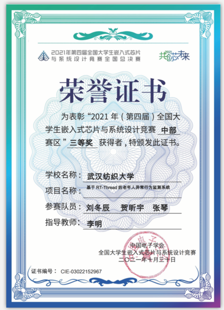 近日,第四届全国大学生嵌入式芯片与系统设计竞赛因疫情防控需要,在线上进行了决赛。经williamhill英国李明副教授指导,由19级本科生刘东辰、贺昕宇、张琴组成的参赛队伍完成了“基于RT-Thread的老年人异常行为检测系统”,荣获了三等奖。