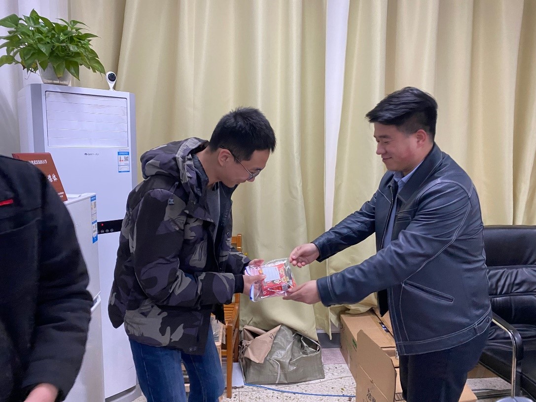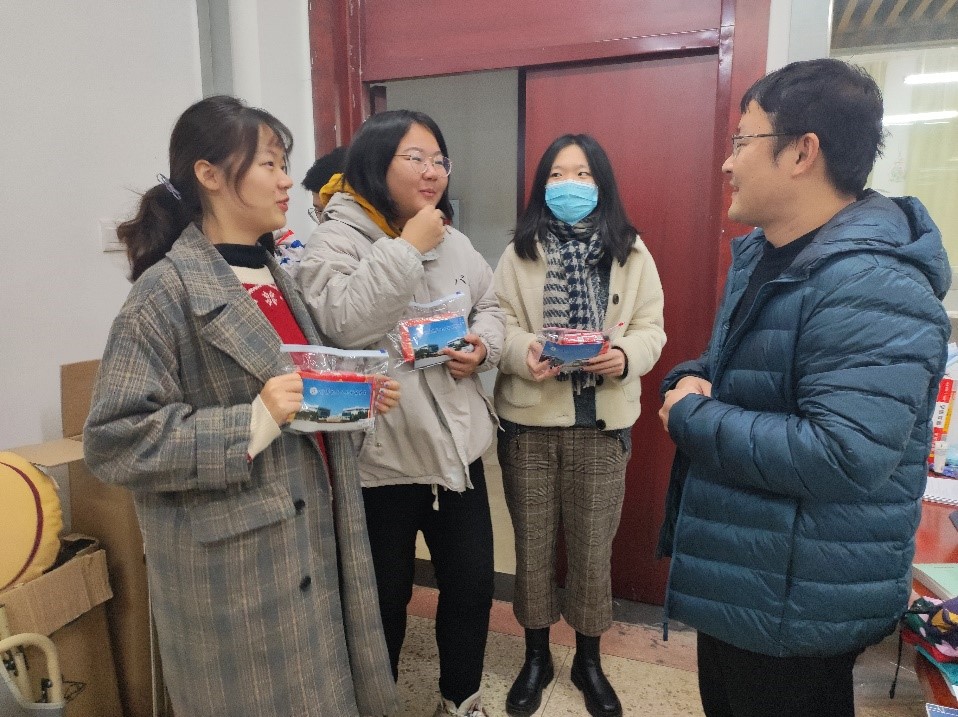 慰问现场,涂书记与考研学子亲切交谈,关心学生的备考状态和心理,提到考研对个人来说是一场意志的磨练,对学院、学校来说是人才培养质量的体现,学院是同学们的坚强后盾,会提供优质的服务,大力支持陪伴同学们的考研之路。廖老师详述了学院精心准备的考研福袋内容和寓意,福袋包括了文具包、牛奶、防疫口罩以及印有学院logo的鼓励卡片,口罩和文具包将陪伴大家步入考场,牛奶寓意“属你最牛、牛气冲天”,卡片上满载着辅导员老师的祝福。蔡老师建议大家放松心情,以平常心对待,调整好心态,礼物虽小却是拳拳心意,希望福袋中的小小礼品,能在艰难备战的冬日给大家带来一些温暖,增添信心。