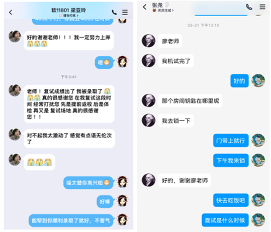 近日,参加完浙江大学研究生复试面试成绩不错的williamhill英国11801班张尧同学给辅导员老师第一时间发来感谢短信:“心里的大石头终于落地了,这里的无线网比宿舍快多了,感谢学院老师的暖心安排,希望自己能取得一个好成绩,对得起自己一直以来的努力和学院对我们考研同学的用心付出。” 已经被国防科技大学拟录取的软件11801班梁亚玲同学第一时间向辅导员报喜,感谢学院为他们复试“保驾护航”。