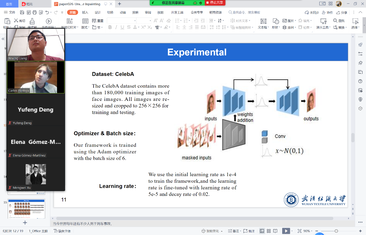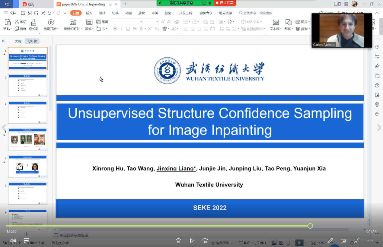 7月3日,迎来第3日的学术报告交流,梁金星博士代表研究团队,在分布式系统和机器学习(Session:Distributed Systems and Machine Learning,DSML)线上会场,做题为《Unsupervised Structure Confidence Sampling for Image Inpainting》的学术报告,交流团队在ImageInpainting领域的最新研究进展,胡新荣教授为研究成果的第一作者,王涛同学为第二作者,梁金星博士为通讯作者。