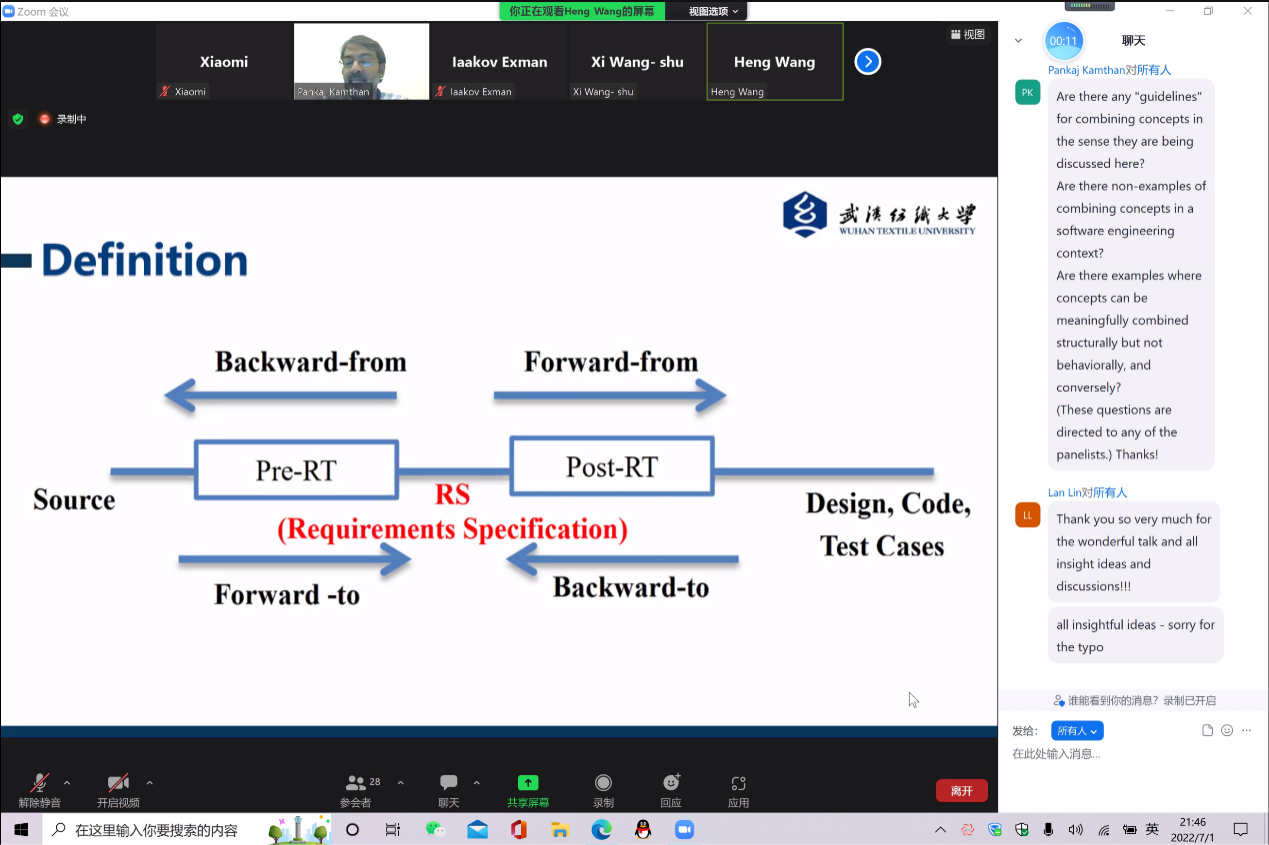 7月1日,汪恒同学在会议开幕式的第一个主题论坛,即需求工程与领域工程(Session: Requirements Engineering and Domain Engineering,REDE)线上会场,做题为《A Systematic Mapping Study of Information Retrieval Approaches Applied to Requirements Trace Recovery》的学术报告,交流团队在软件需求跟踪(RequirementsTraceability)领域的最新研究进展,王帮超博士为研究成果的第一作者,汪恒同学为第二作者。