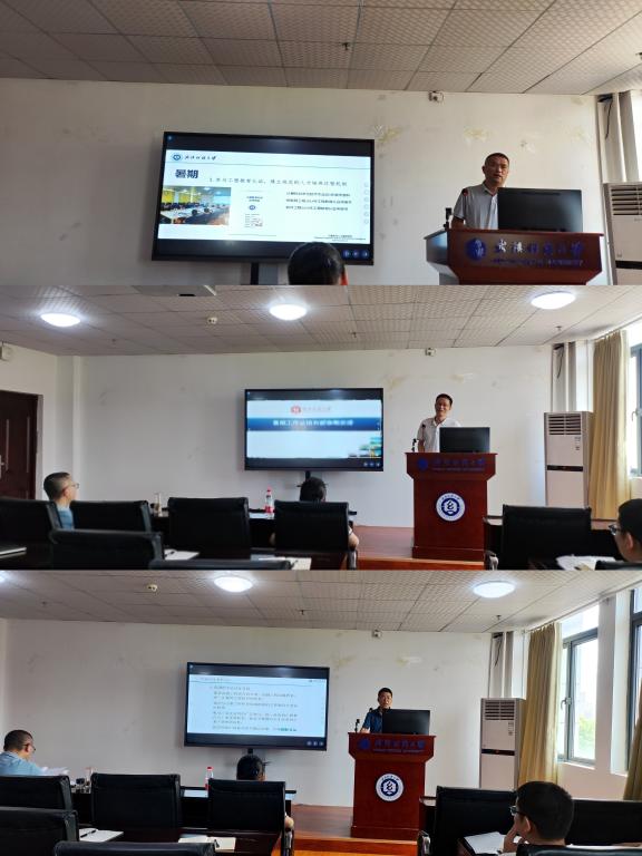 院长胡新荣从暑期科研基金申报、工程教育认证、学生社会实践、课程建设、人才引进等方面做了详细总结,肯定了青年博士、专任教师、学工队伍在暑假期间的工作成绩,并寄寓了新学期新的要求。在科研方面,强调要不断提高基金申报的积极性、基金项目的写作能力;鼓励青年教师积极加入高水平研究团队,不断积攒经验,提高科研水平。在教学方面,指出下学期将持续完善教学机构,优化系部分工,充分激发各系老师的积极性;加强省一流课程建设,提升教学质量。副院长魏雄、彭涛分别就教学工作、科研工作、研究生工作进行了具体汇报,潘雄教授就工程教育专业认证标准进行了详细解读。