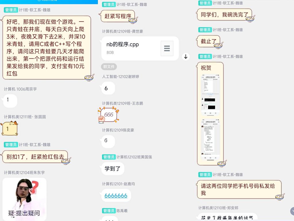 封控期间,学生情绪敏感易躁,为缓解学生焦虑情绪,魏雄副院长利用专业知识,在年级群发起互动小游戏。将一道数学题与计算机专业知识相结合,组织同学们用C或C++写程序解决数学问题,并鼓励第一位和最后一位把源代码和运行结果发给他的同学,将有支付宝10元红包奖励。这个小游戏极大地缓解了同学们的焦虑情绪,增强了师生间的互动,也拉近了老师与学生之间的距离,让同学们感受到即使在宿舍,老师和大家的心是在一起的。