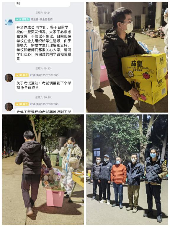 疫情就是命令,防控就是责任,学院党委书记晏伟、副书记向涛响应学校要求立即采取应急措施,组织全体辅导员、教师志愿者入驻5栋宿舍楼,承担起5栋学生宿舍的包保任务。安排学生有序核酸检测、送餐送水、发放物资、安抚学生情绪,为学生提供全方位的贴心服务,充分保障封控学生的日常生活不受任何影响。晚上,晏伟书记和向涛书记带头,整夜在宿舍值班室值夜班,随时应对突发情况,守护学生安危。