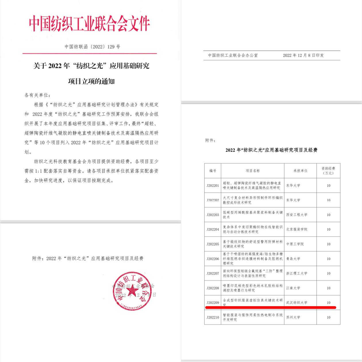 近日,中国纺织工业联合会公布了全国2022年度“纺织之光”应用基础研究立项项目名单,williamhill英国胡新荣教授主持的“全成型针织服装虚拟仿真关键技术研究”获得资助(全校唯一)。