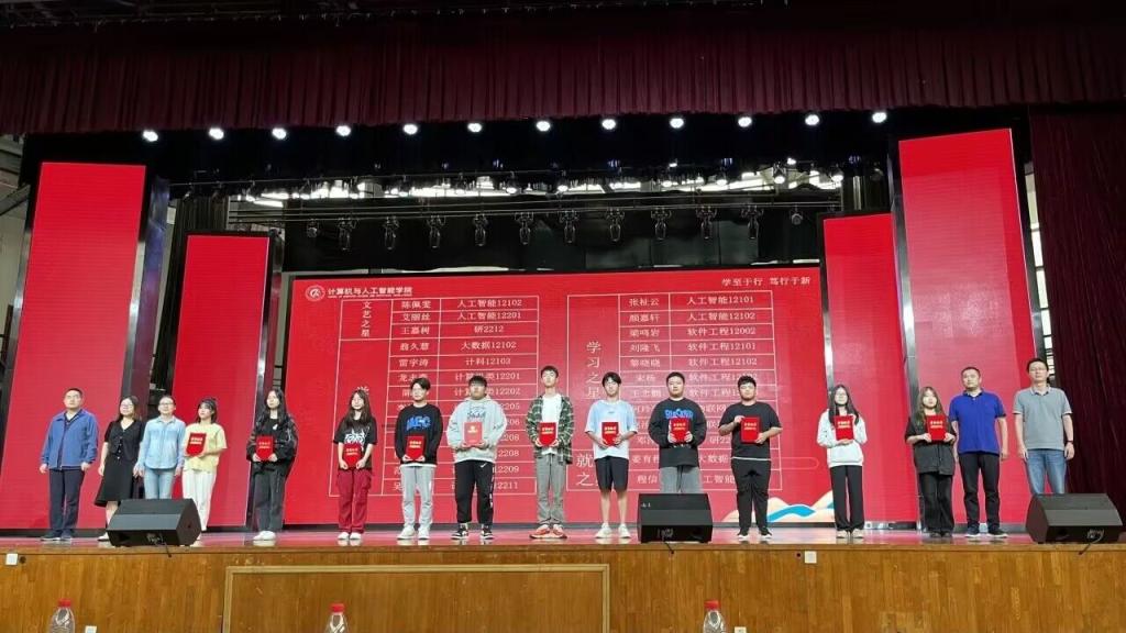为了充分展示我院学生朝气蓬勃、积极向上的精神风貌,更好地发挥优秀学生的示范引领作用,促进学院优良学风、院风建设,营造良好的文化氛围,学院开展了“计智之星”评选活动。魏雄、彭涛、叶鹏、李丽、陈佳五位老师分别为创新之星、创业之星、公益之星、社团之星、实践之星、体育之星、文艺之星、学习之星和管理之星等“计智之星”获得者代表颁发荣誉证书。