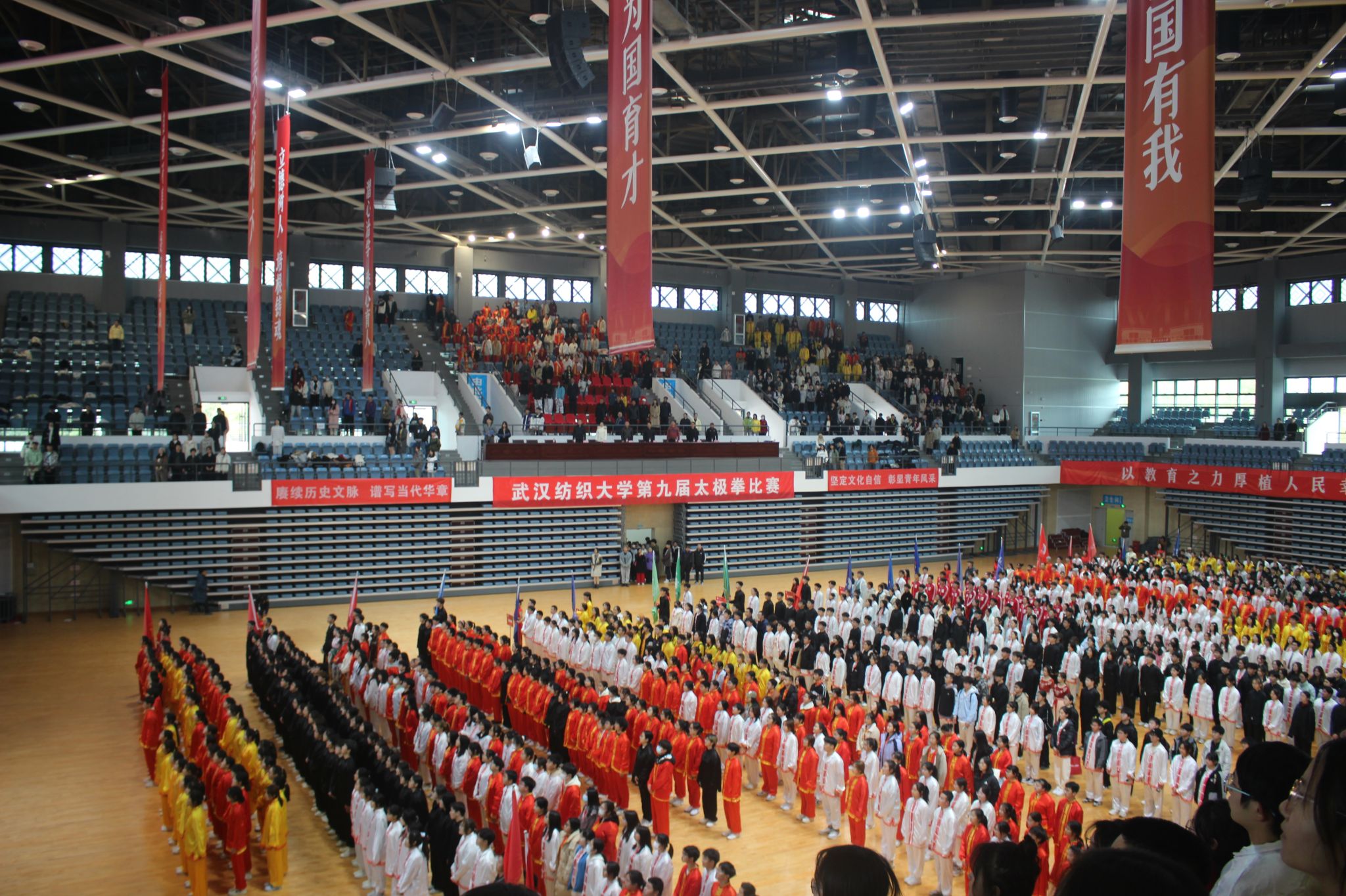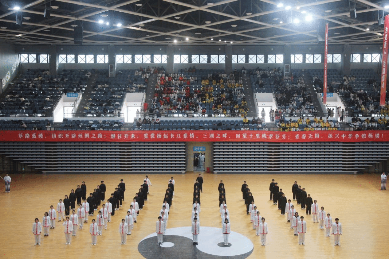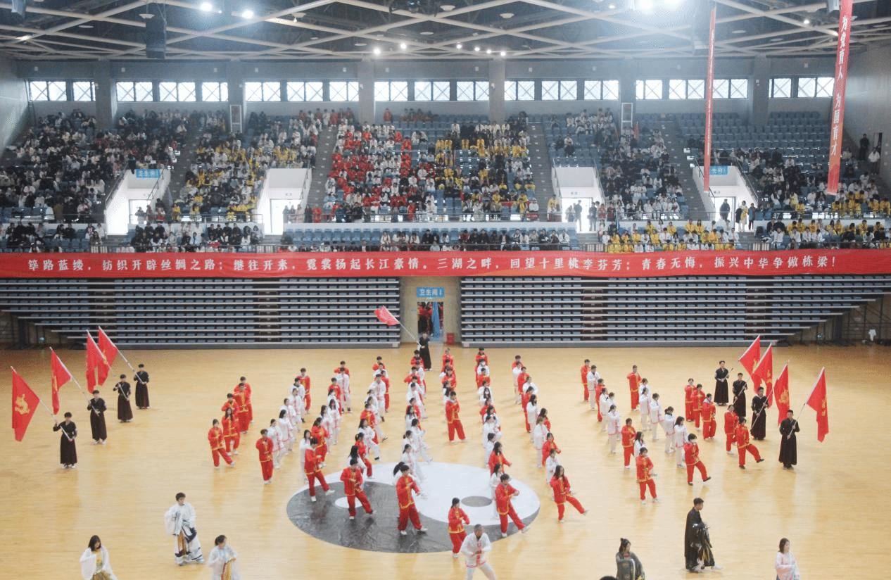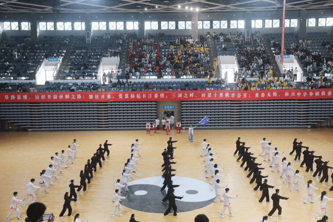 赛场上,各学院参赛代表精神饱满、朝气蓬勃,院旗挥舞、红旗飘扬,伴随悠扬的音乐、展示行云流水的动作,刚柔并济的招式,配合或以古典扇舞、以流行音乐、以国风元素、以中国武术等,将太极拳的舒展大方、急缓相间表现得淋漓尽致。在表演过程中,各学院融入口号、队形、横幅、旗帜等元素,以饱满的热情和娴熟的技艺,充分展现了纺大学子的文化自信,表达了爱党爱国爱校荣校的强烈热情,充分展示中国传统文化与太极瑰宝的独特魅力。