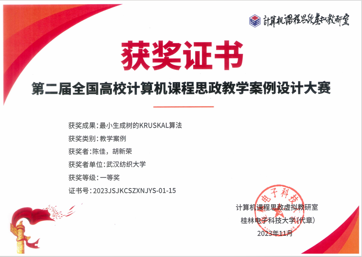 软件工程教研室获批湖北省优秀基层教学组织,成立了课程思政研究中心,获全国高校计算机课程思政教学案例大赛一等奖1项;获批湖北省一流课程4门,出版教材2部,新增网络空间安全专业;获中纺联教学成果奖5项,全国高校人工智能教师教学创意竞赛湖北赛区一等奖1项、二等奖1项。