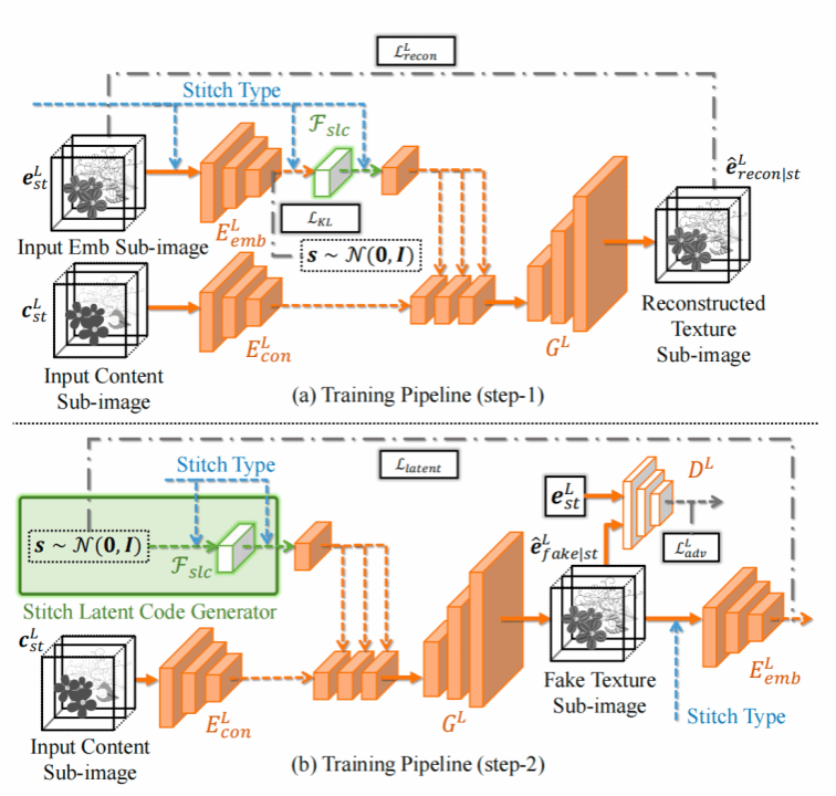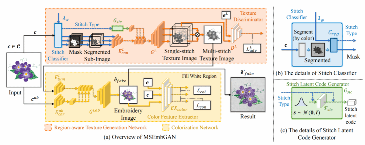 MSEmbGAN模型首先识别输入图像区域内的缝线类型,根据识别的缝线类型生成相应的刺绣纹理,最后优化结果的整体颜色。为了实现上述功能,课题组提出了两个子网络,即区域感知纹理生成网络 (Region-aware Texture Generation Network,)和着色网络(Colorization Network, )。