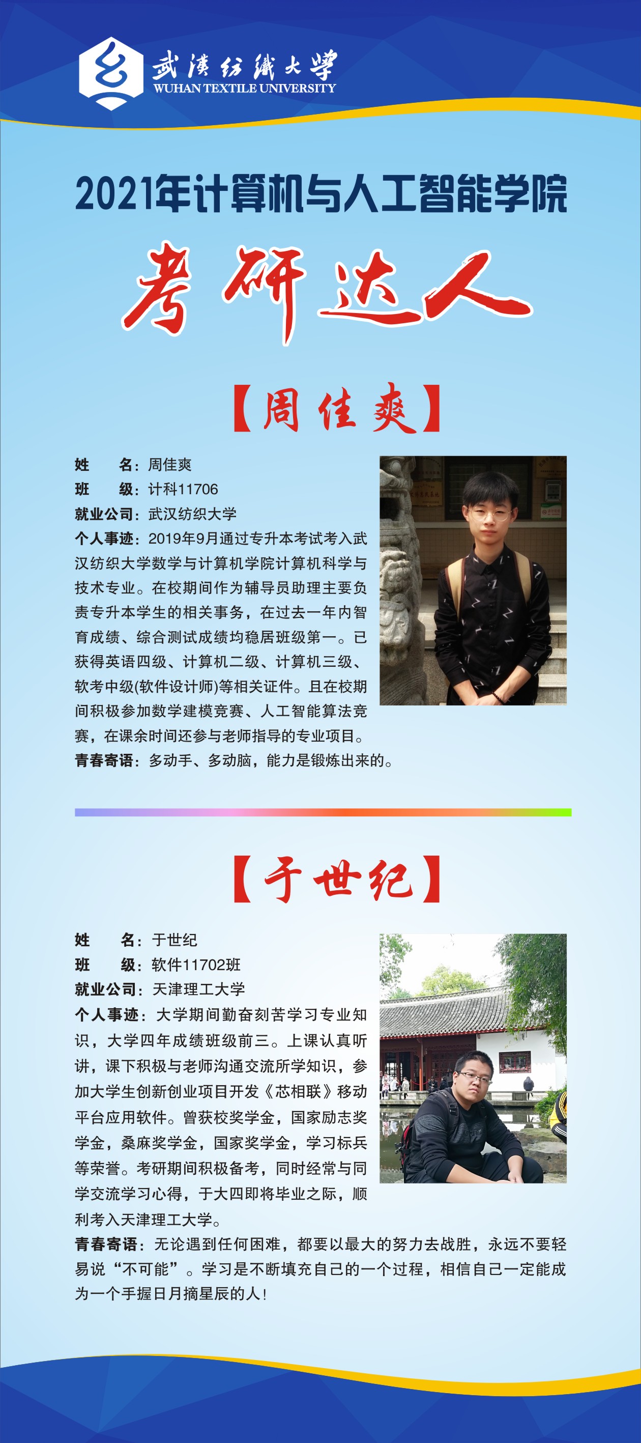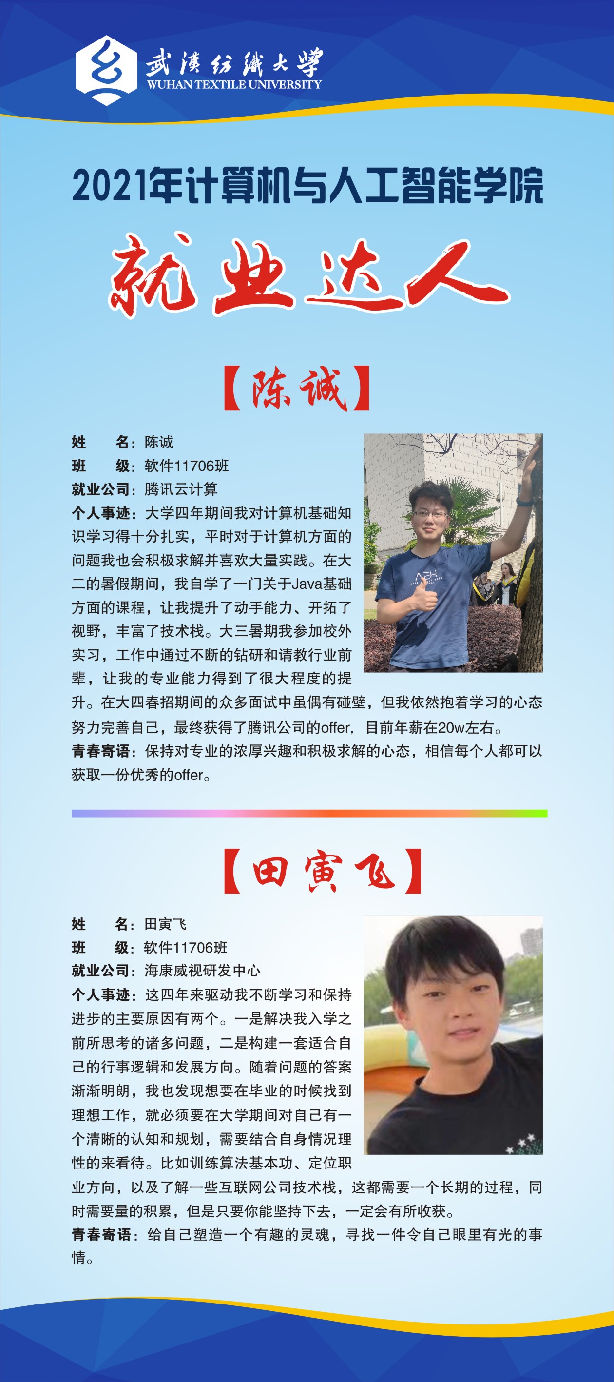 专业介绍:本专业顺应国家对人工智能人才的需求,面向人工智能领域的应用开发,算法设计等人才紧缺领域,培养掌握人工智能领域的理论知识和工程技术,富有家国情怀和奋斗精神,具有较强的创新和实践能力,能解决人工智能及相关领域复杂工程问题能力的高素质复合型创新人才。目前数据科学与大数据技术与人工智能这两个专业都隶属于计人工智能系。人工智能系共有专业教师8名,其中教授1名,副教授3人,具有博士学位7人,“阳光拔尖人才”1名,近年来,本专业教师获湖北省科技进步三等奖1项、多名教师获学校教学质量优秀奖、学校“科研标兵”、英国威廉集团科技进步二等奖等荣誉称号。近年来,本专业教师承担了国家自然科学基金项目、国家档案局科技项目、湖北省自然科学基金项目、湖北省教育厅重点项目和中青年人才项目,以及湖北省统计局项目等15项,出版教材2部,发表A类以上高水平论文10余篇,申请国家专利5项。主持横向项目十余项,项目经费进账600余万。拥有大数据服务中心、人工智能创新实验室、人形机器人实验室、工业机器人实验室、计算机机房、机器视觉实验室、嵌入式系统创新实验室等。同时,在人工智能等专业实践与应用场景方面,在服装产业数字化、智能化领域积极布局,拥有湖北省服装信息化工程技术研究中心、云计算研究所、机器学习研究所及大数据工程中心,还与科大讯飞、万方数据、奥浦信息等企业联合共建了人工智能实验室、纺织大数据研发中心、信息安全实验室等研发基地。、主要开设课程:计算机相关课程(程序设计语言,数据结构,数字逻辑,编译原理,操作系统,计算机网络原理,计算机组成原理);人工智能相关课程(算法分析与设计,数字图像处理,最优化方法,控制理论与方法,神经网络,机器学习,深度学习与应用,自然语言处理)。
