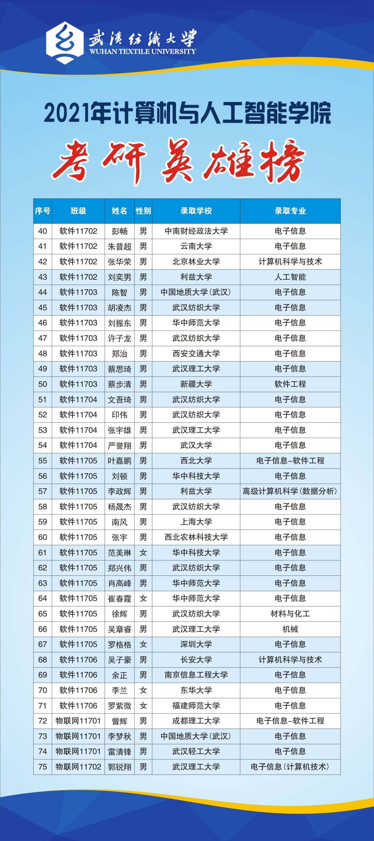 专业介绍:软件工程专业入选湖北省一流本科专业建设点,是湖北省战略新兴支柱产业人才培养试点专业本专业面向软件行业,本专业采用以项目为背景的教学方式,“三位一体”的育人模式,贯彻面向岗位、面向综合素质、面向个性化的三个面向原则,培养具有扎实的计算机软件理论知识、熟练掌握软件工程领域前沿技术和软件开发方法,具备规范的软件设计、开发、测试和项目管理能力,具有较强的实践能力和创新精神,良好的组织与交流能力,能够按照工程化方法从事软件项目开发和管理的专业技术人才。现有专任教师17人,其中湖北省“百人计划”1人,武汉市“黄鹤英才计划”1人,高级职称8人,其中具有博士学位11人、5人有海外留学经历,4人具有海外博士后研究经历。