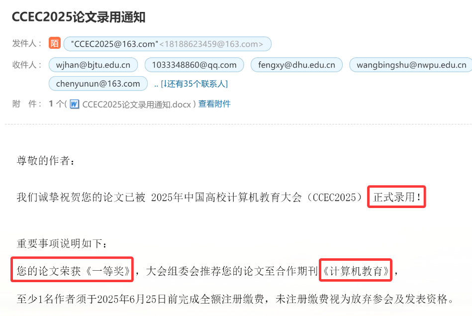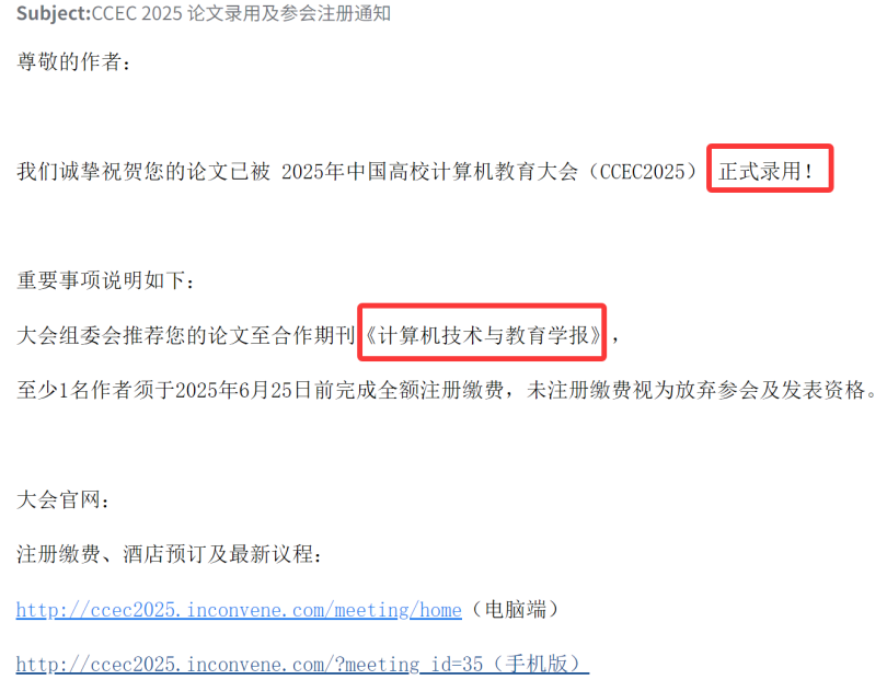 近日,2025年中国高校计算机教育大会(CCEC2025)公布了今年的论文录用结果,软件工程23级本科生袁瑛凯、冯亚梦同学分别作为学生一作的两篇论文,均被大会录用发表。其中,袁瑛凯同学参与的论文荣获大会《一等奖》(获奖率9.79%),被推荐到计算领域高质量科技T2类期刊(又称“CCF中文B刊”)《计算机教育》发表,该篇论文(以下简称“第一篇论文”)的第一作者为万红艳老师,通讯作者为王帮超老师;冯亚梦同学参与的论文,被推荐到全国高校计算机教育研究会会刊《计算机技术与教育学报》发表,该篇论文(以下简称“第二篇论文”)的第一作者为叶鹏老师,通讯作者为叶璐瑶老师。