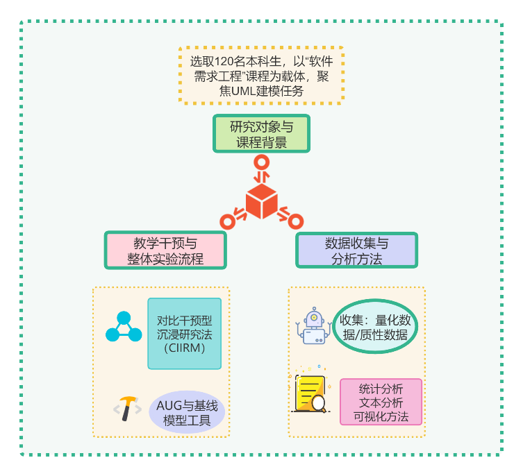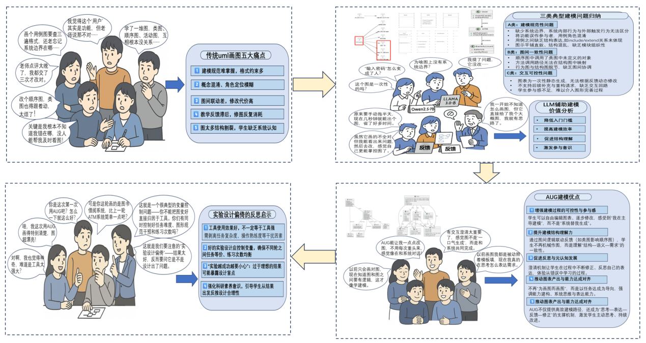 第一篇论文《人机协同背景下软件需求建模课程教学改革与实践》指出:在人机协同赋能数智化教育转型背景下,针对软件需求建模教学中长期存在的学习门槛高、反馈滞后等核心痛点,基于“问题发现—方案构建—效果验证”的科研方法论框架,系统性探究了大语言模型(LLM)在辅助教学中的适配边界与优化路径。研究通过预实验揭示当前主流LLM在软件需求建模任务中存在的语义偏差与逻辑结构失洽问题,据此设计开发了融合交互式澄清机制的需求建模工具AUG,并组织120名本科生开展对照实验,从技术接受度、建模产出质量、学习者主观反馈等三个维度进行实证分析,发现了AUG在降低认知负荷、提升建模精确性方面的显著优势。本研究提出了四项AI驱动的教学改进建议,并从方法论层面构建了“AI工具赋能+科研思维训练”的双螺旋教学范式,为智能时代工程教育转型提供了理论与实践的双重参考