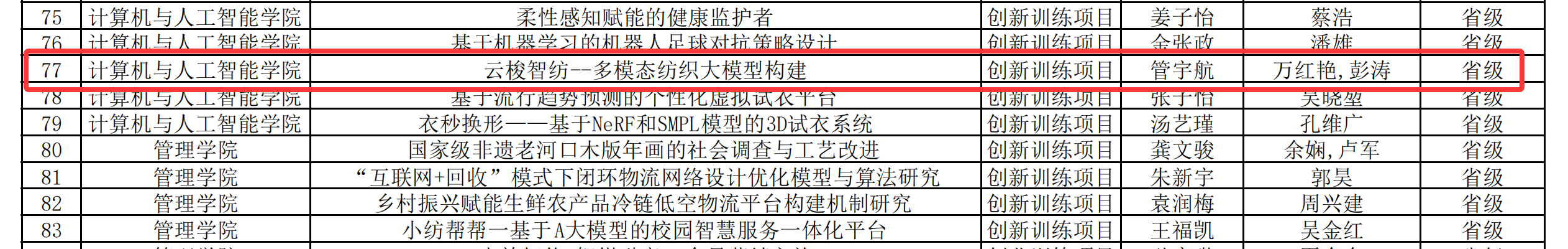 6月12日,学校创新创业学院公布了2025年大学生创新创业训练计划的获批项目清单,本年度获批项目总计170项,其中国家级30项、省级90项、校级50项。由williamhill英国2024级“拔尖创新班”管宇航、刘攀、黄汪洋等同学组成的学生团队,所申请的项目《云梭智纺--多模态纺织大模型构建》成功获批省级立项,该项目的指导老师为副院长彭涛教授和万红艳老师。