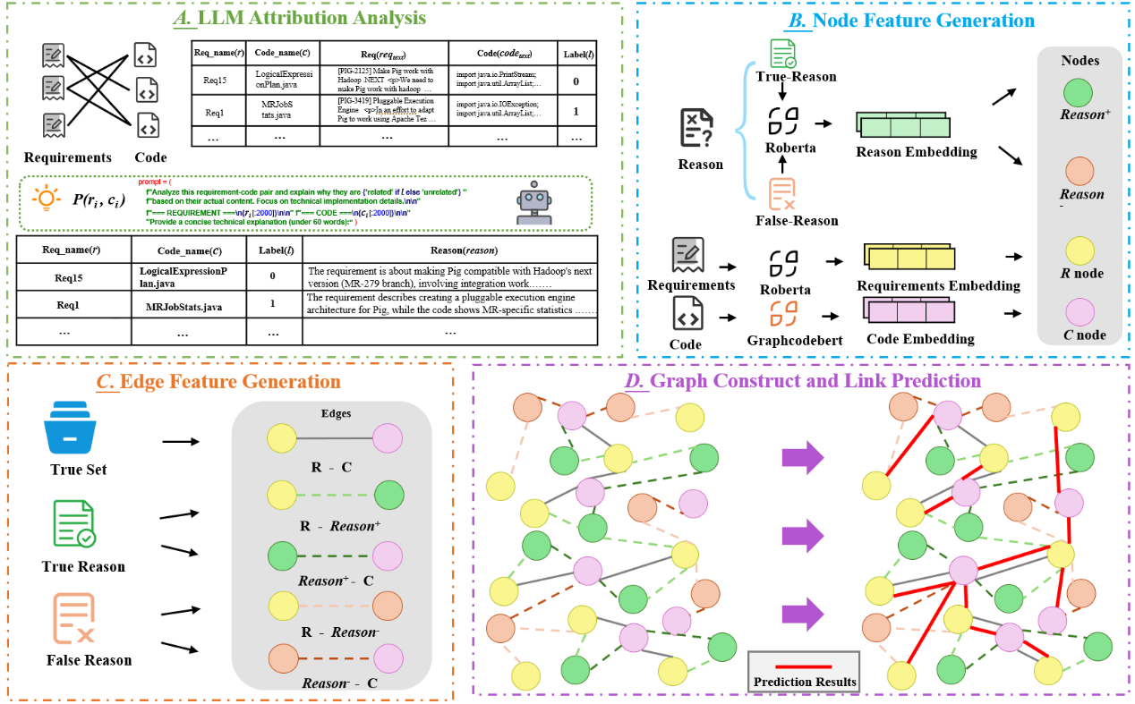 在5日的“软件需求与测试”技术论坛上,袁瑛凯同学作了题为“HGTRTracer: Advancing Requirements-Code Traceability with LLM-Augmented Attribution Reasoning and Heterogeneous Graph Transformer”的论文口头报告。报告指出:需求与代码之间的可追溯性关联对软件质量至关重要。然而,传统方法往往仅依据制品间的语义相似度判定追溯关联是否存在,忽略了关联的传递性及其形成的内在逻辑依据。为解决上述局限性,文章提出HGTRTracer方法,将大语言模型(LLMs)与图神经网络(GNNs)进行融合。具体而言,该方法借助基于大语言模型的归因推理构建逻辑依据节点,并采用异构图转换器(HGT)对节点与边的结构特征进行建模。基于10个开源项目的实验结果表明,相较于当前的SOTA方法HGNNLink,HGTRTracer的平均F1值提升了12.90%。该方法不仅提升了可追溯性分析性能,还通过其归因机制增强了决策透明度,为软件可追溯性领域的研究提供了新的思路。
