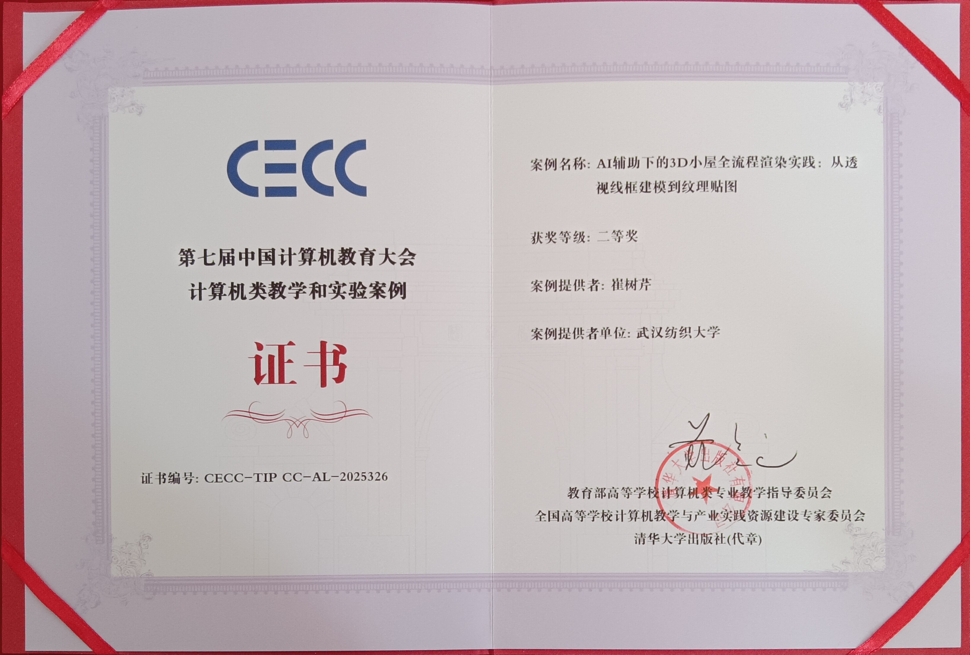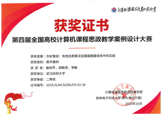 凭借在课程思政方面的创新实践,课程负责人崔树芹设计的思政案例“衣彩智绘:有效边表算法在服装图案填充中的实践”荣获第四届全国高校计算课程思政教学案例设计大赛二等奖。