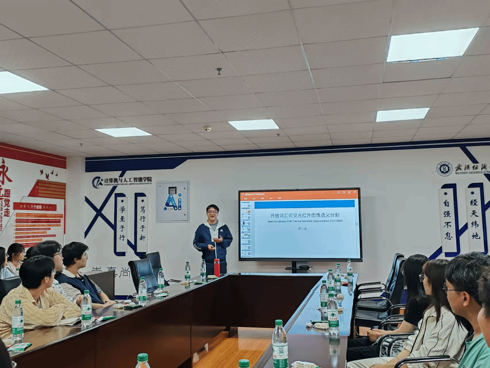 下午3点半,活动准时开始。会议室内,师生们围坐一堂,气氛热烈而专注。李主任和晏书记先后致辞,他们对本次活动的目的和意义进行了详细介绍,并强调了文献阅读在学术研究中的重要性,以及加强本科生科研能力培养的必要性。随后,颜小运挑选了学院今年7月被ECCV2024会议录用的一篇学术论文,与师生们一同进行研读。